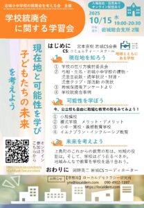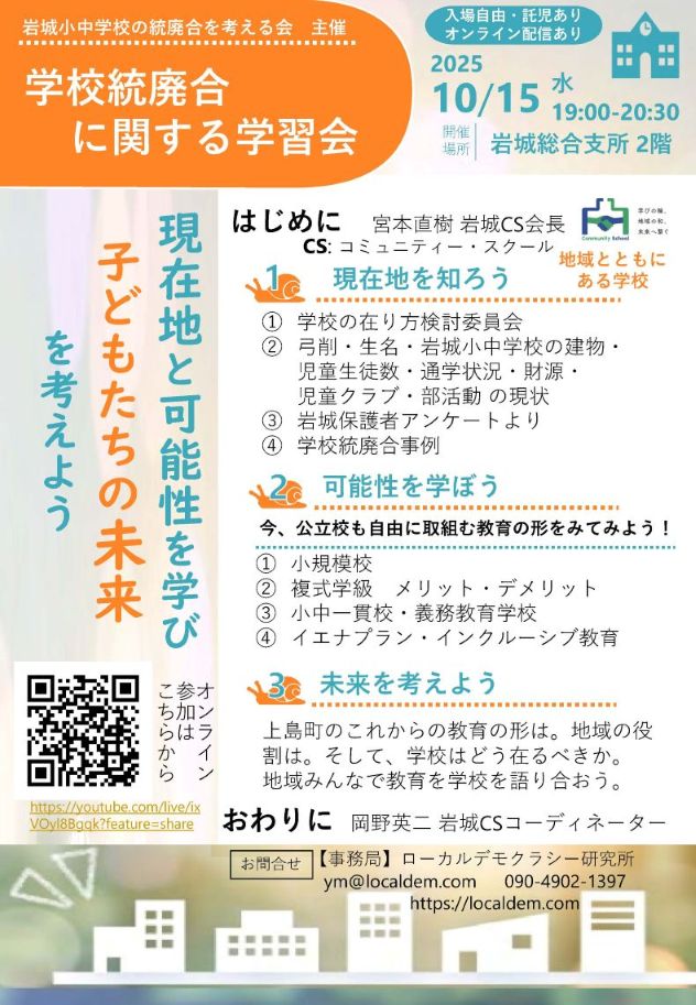 説明してくれないなら自ら学ぼう。このたび『岩城小中学校の統廃合を考える会』主催で学習会を開催することになりました。弊所が事務局を担当します。10月はこの町のお祭り月のため週末を避けた結果、平日10/15(水)夜7時開催です。託児あり、オンライン参加も可能です。