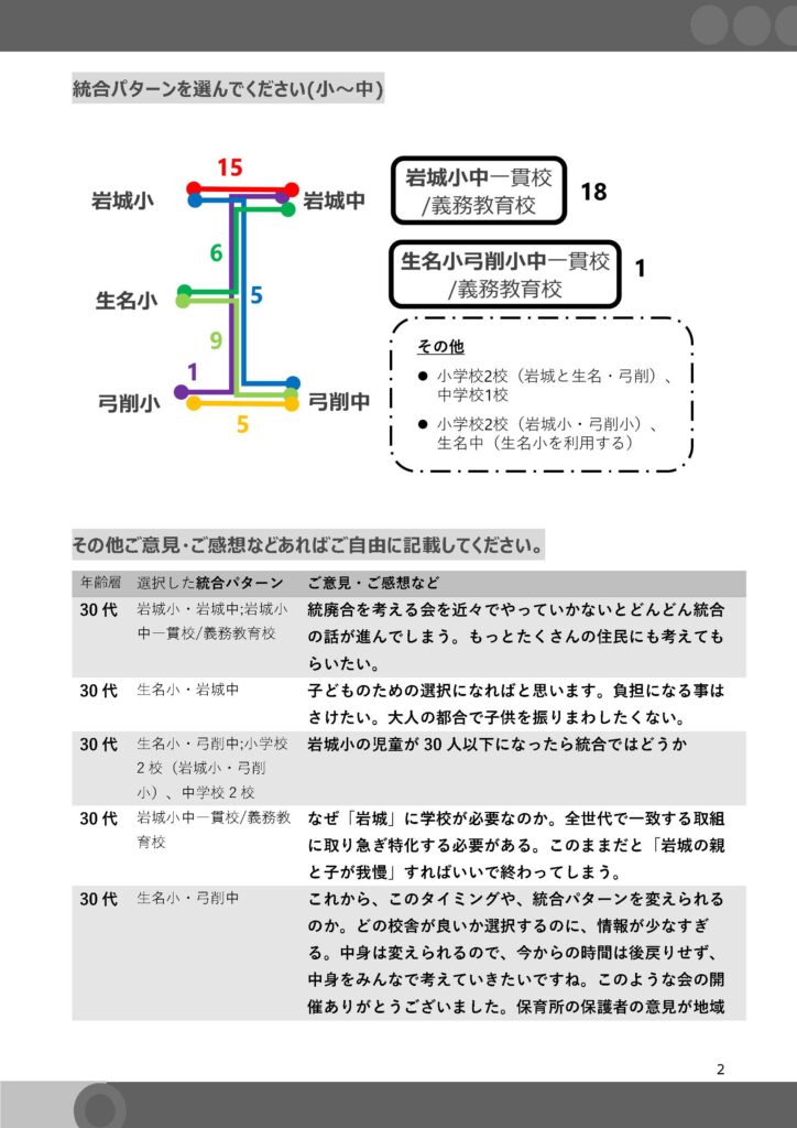 先のブログで動画公開しました「学校統廃合に関する学習会」、第3部で実施したアンケートの集計結果をご報告いたします。 参考:学習会当日動画 前半 / 後半、参加者の思いまとめ 岩城小中学校の統廃合を考えるアンケート 集計結果 投稿ナビゲーション 10/15学校統廃合に関する学習会の動画公開 10/15学習会ワークショップで寄せられた参加者の思いのまとめ