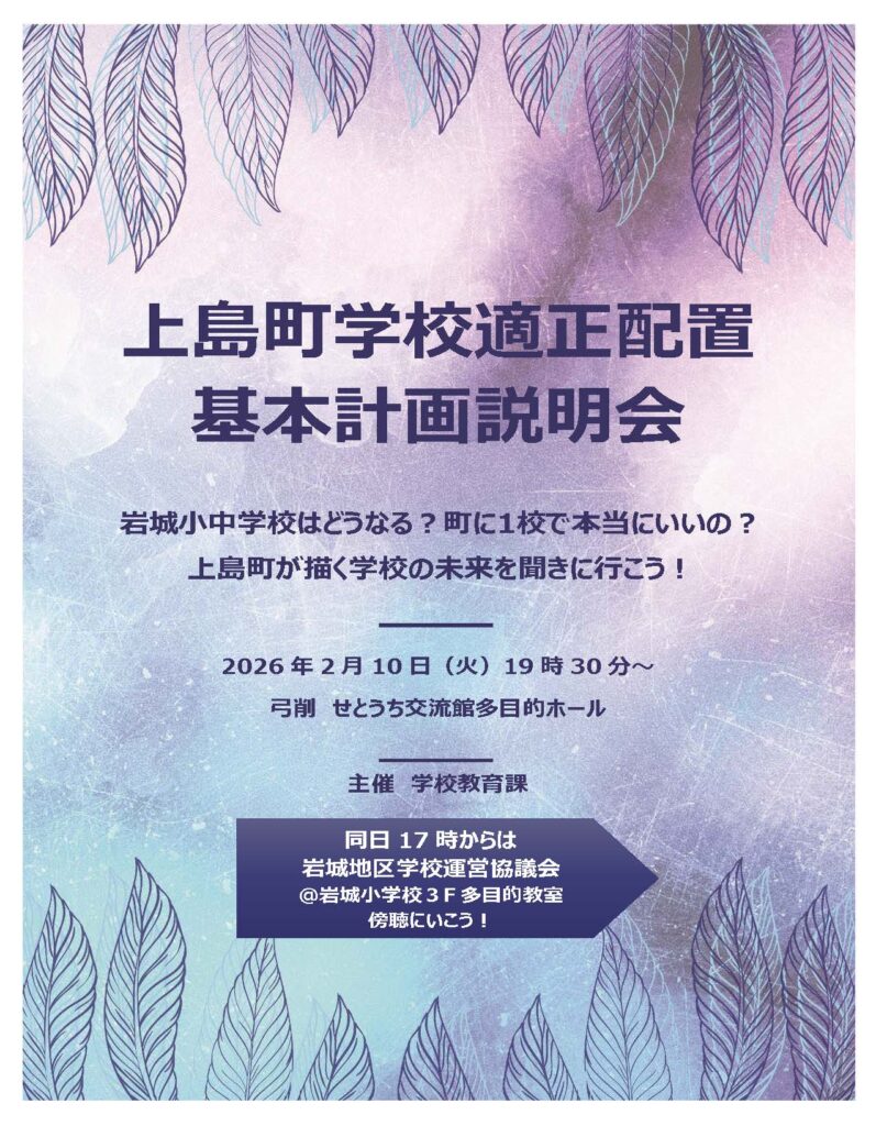 上島町は、上島町学校適正配置基本計画、つまり学校統廃合の方針について説明会を開催します。どなたでも参加できます。